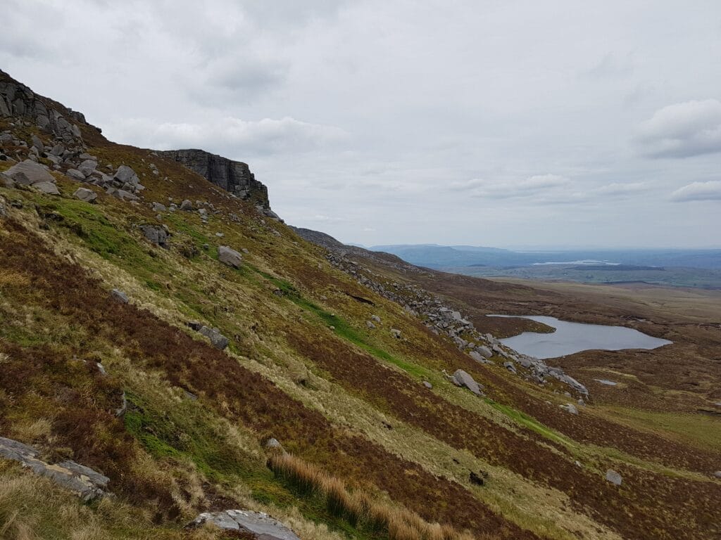 Na zboczach Cuilcagh można zobaczyć niewielkie górskie jeziora oraz charakterystyczne, surowe ściany skalne. To krajobraz typowy dla regionów kształtowanych przez lodowiec.